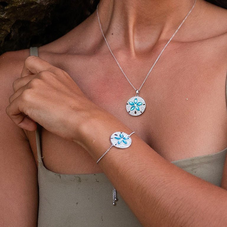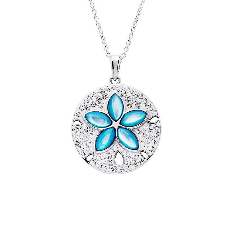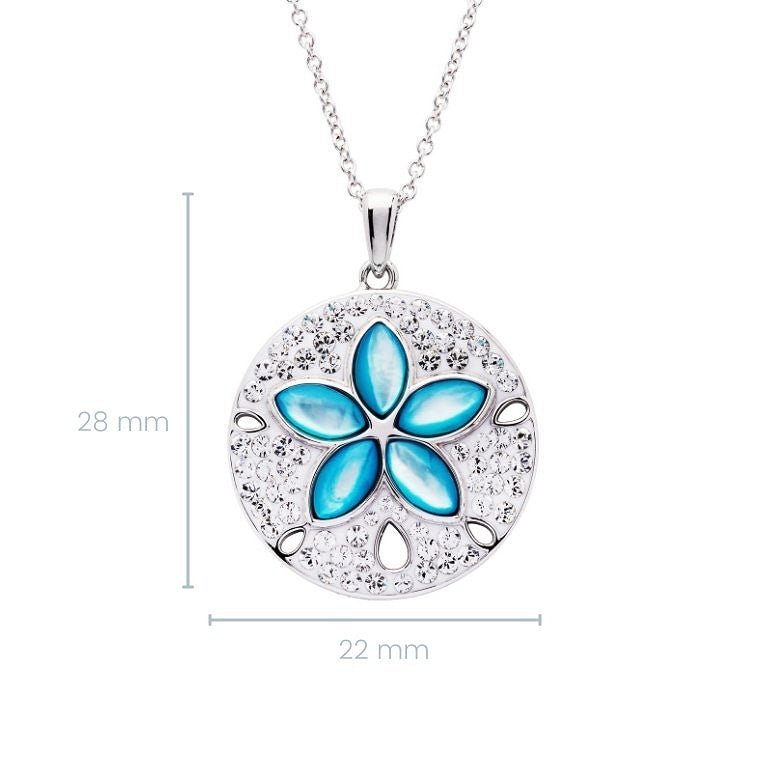 Carry the beauty and calm of the sea wherever you go with this stunning Sterling Silver Sand Dollar Pendant. Inspired by ocean treasures, this piece combines five iridescent aqua blue mother-of-pearl slices with sparkling white crystal accents, creating a luminous reflection of the sea’s serenity.