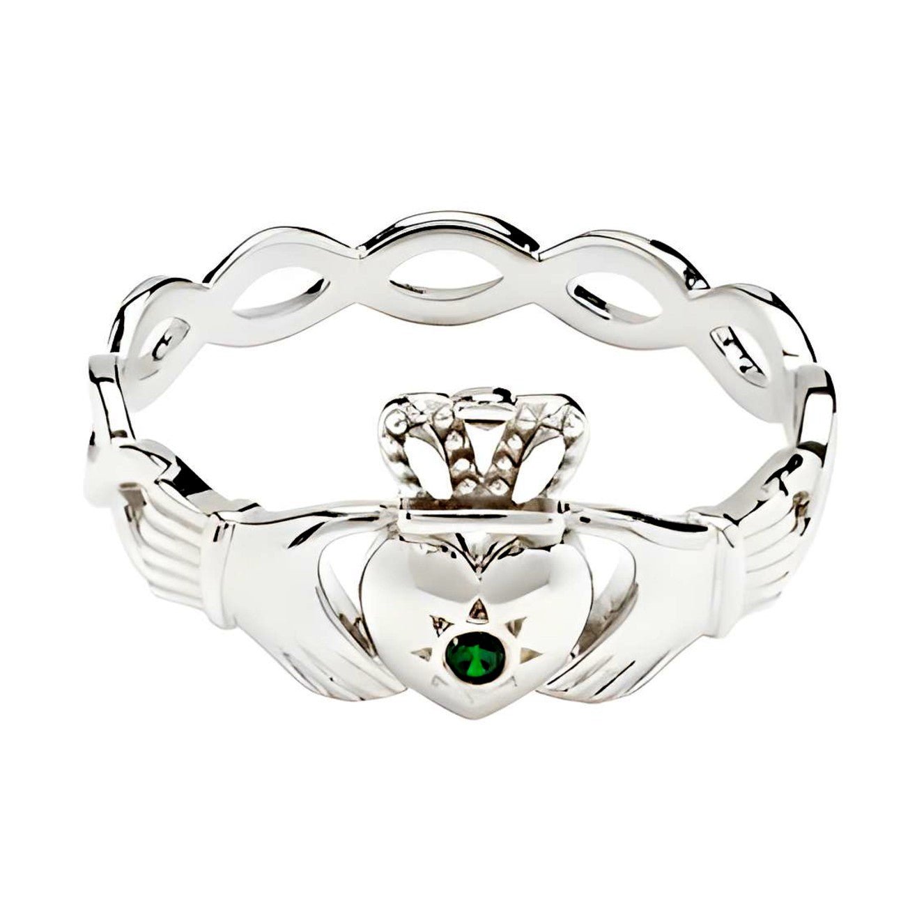 Ladies Sterling Silver Claddagh Ring with Infinity Band and Green CZ Stone SL116