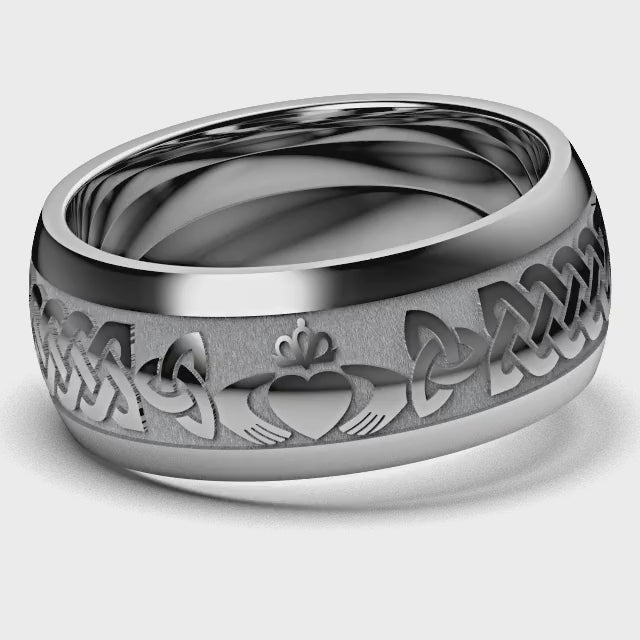 Celebrate your love with the timeless beauty of the Tungsten Claddagh Wedding Ring. Designed with intricate Celtic details, this 10 mm band is both elegant and meaningful. Each ring showcases two Claddagh symbols representing love, loyalty, and friendship, as well as trinity and Celtic knot designs that flow seamlessly around the band.